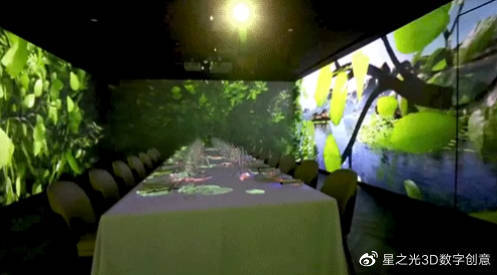 全息餐廳,也就是所謂的5D全息餐廳,摒棄了傳統(tǒng)的裝飾,采用了一種多媒體的方式,利用投影儀將主體材料投射到餐廳的墻壁、地面和餐桌上,實(shí)現(xiàn)了3D視覺的立體效果。