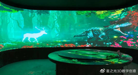 全息餐廳是以餐廳墻壁、幕布、桌面、地面、天花等為投影載體,以動態(tài)圖像為基礎,通過動畫制作,實現(xiàn)餐廳空間的動態(tài)立體視覺。