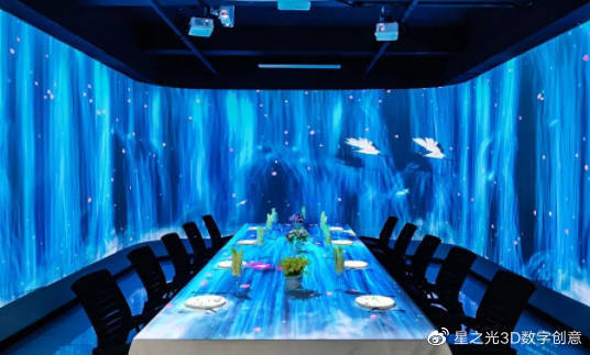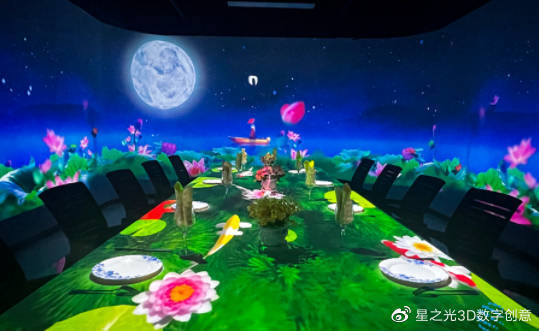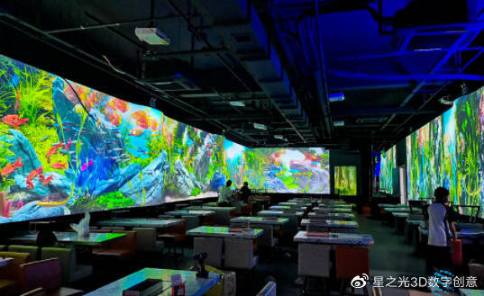 全息餐廳,又被稱為5D餐廳、沉浸餐廳、光影餐廳、5D光影網(wǎng)紅餐廳,這些都是現(xiàn)代科技的產(chǎn)物,利用技術(shù)將3D影像投射到墻壁上,打破了傳統(tǒng)的裝修方式,給人一種沉浸式的享受。