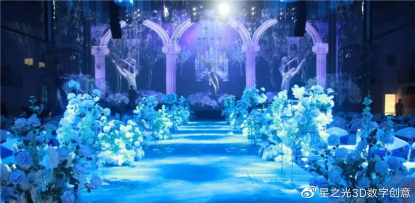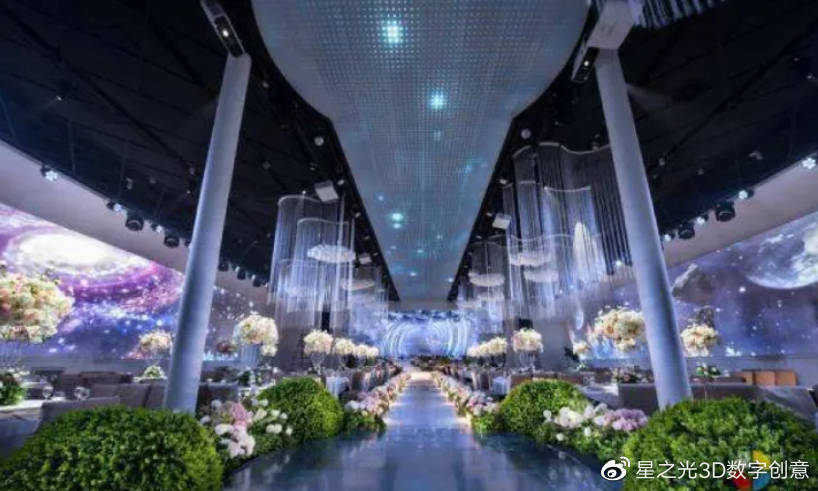 5D立體影像和其他高科技的結(jié)合,打造出一種如夢似幻的婚禮現(xiàn)場!鮮花、海水、城堡、星空等主題的隨意展示,給人以強(qiáng)烈的視覺沖擊。