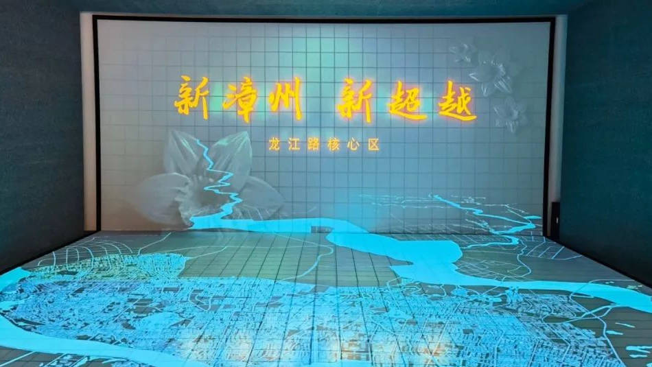 以L型折幕為載體,上下雙屏聯動,打造數字沙盤影院,展示漳州未來核心區(qū)的城市職能與景致。